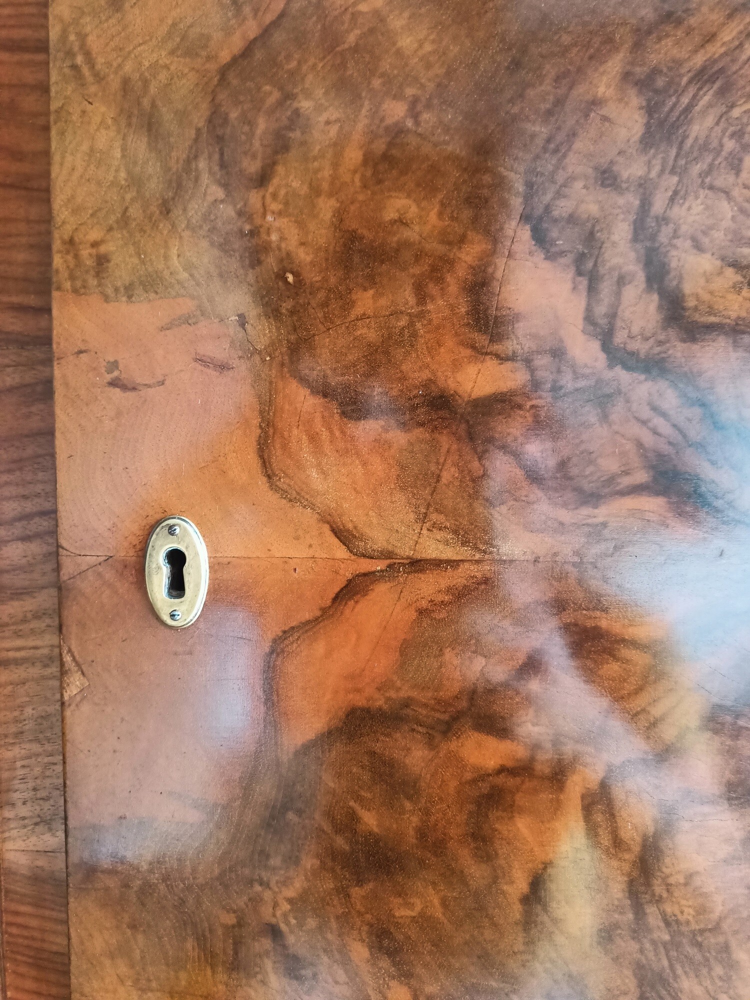 Jako, że była to rodzinna pamiątka dołożyliśmy pełnych starań aby przywrócić jej dawny blask. Komoda wymagała wielu napraw w tym uzupełnianie ubytków forniru. Na koniec nałożona została nowa powłoka politury szelakowej.
