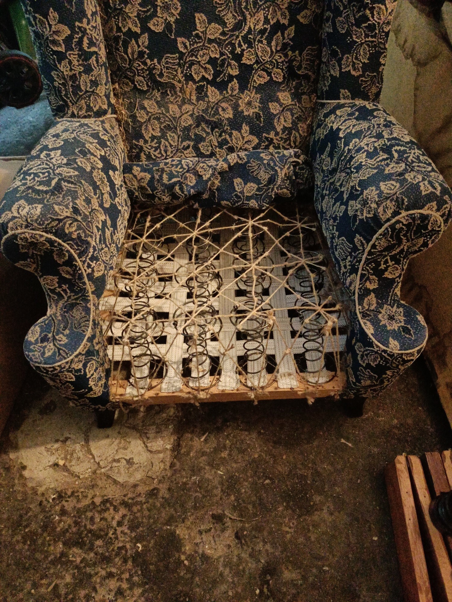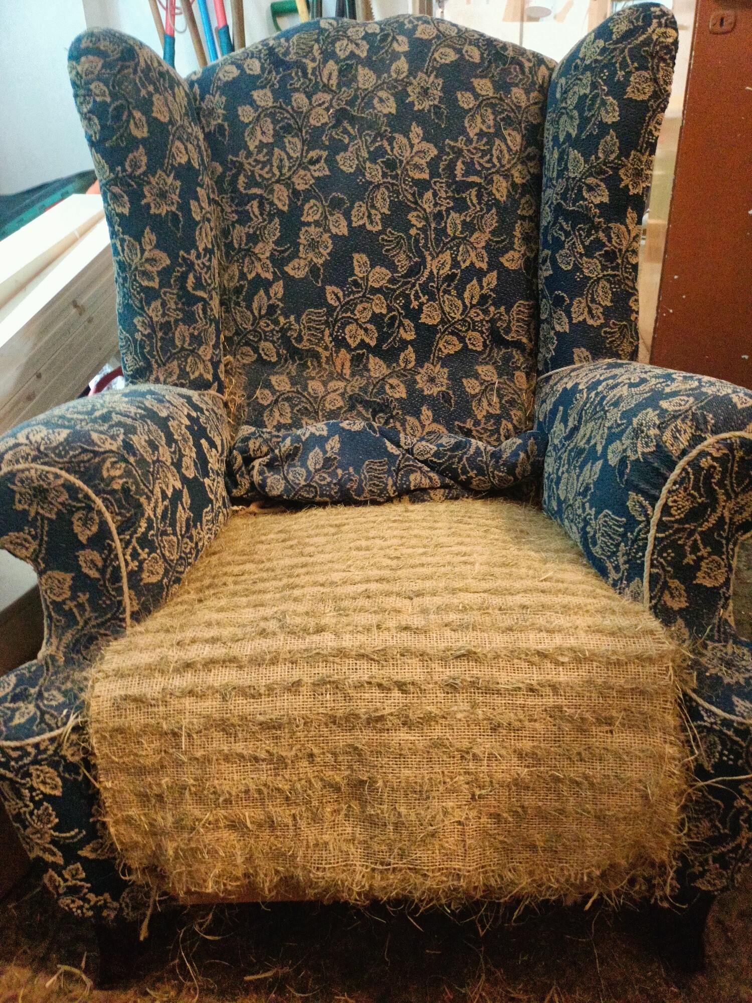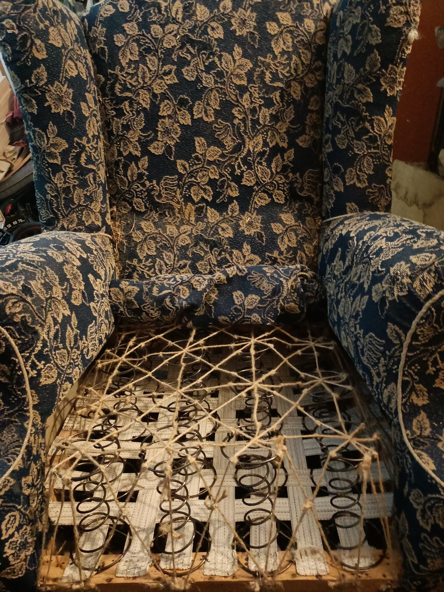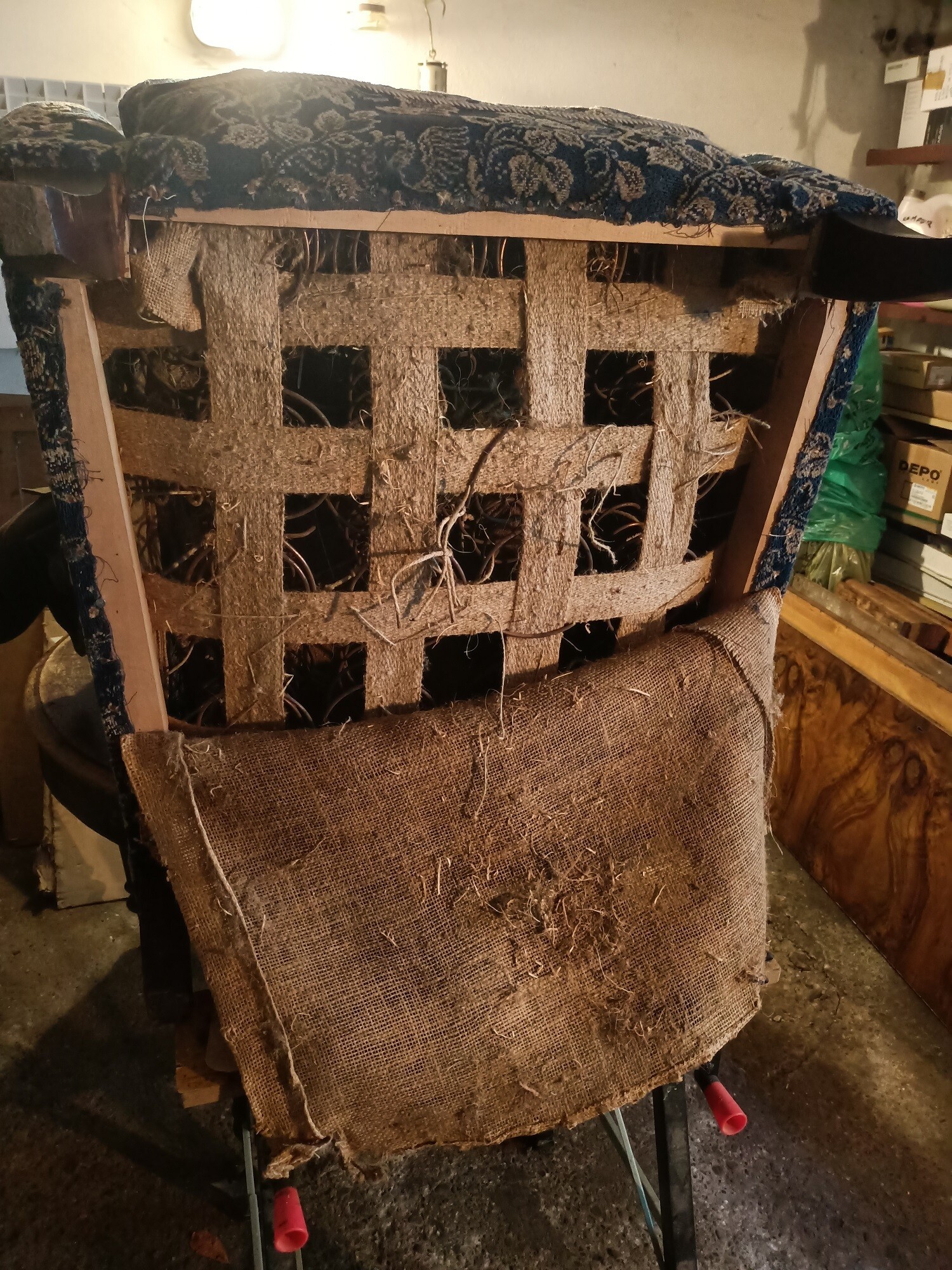 Ten ponad 100-letni fotel posiada tapicerkę w wyjątkowo dobrym stanie. Klientowi zależało aby zachować oryginalne poszycie natomiast naprawy wymagały sprężyny oraz pasy. Nowe sprężyny zostały tradycyjnie związane a na nie położona nowa warstwa trawy morskiej.