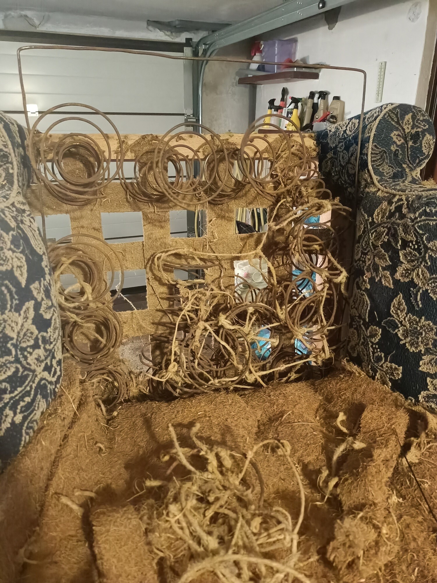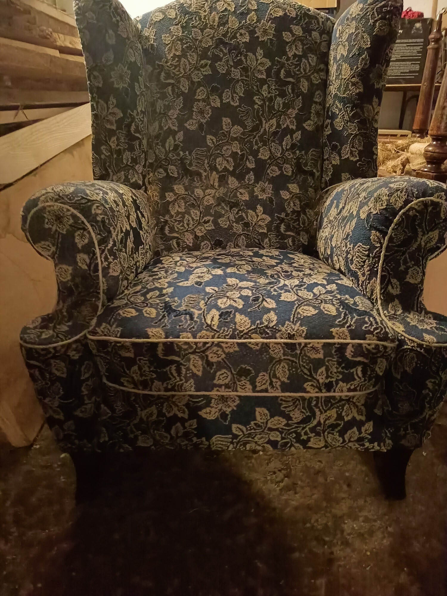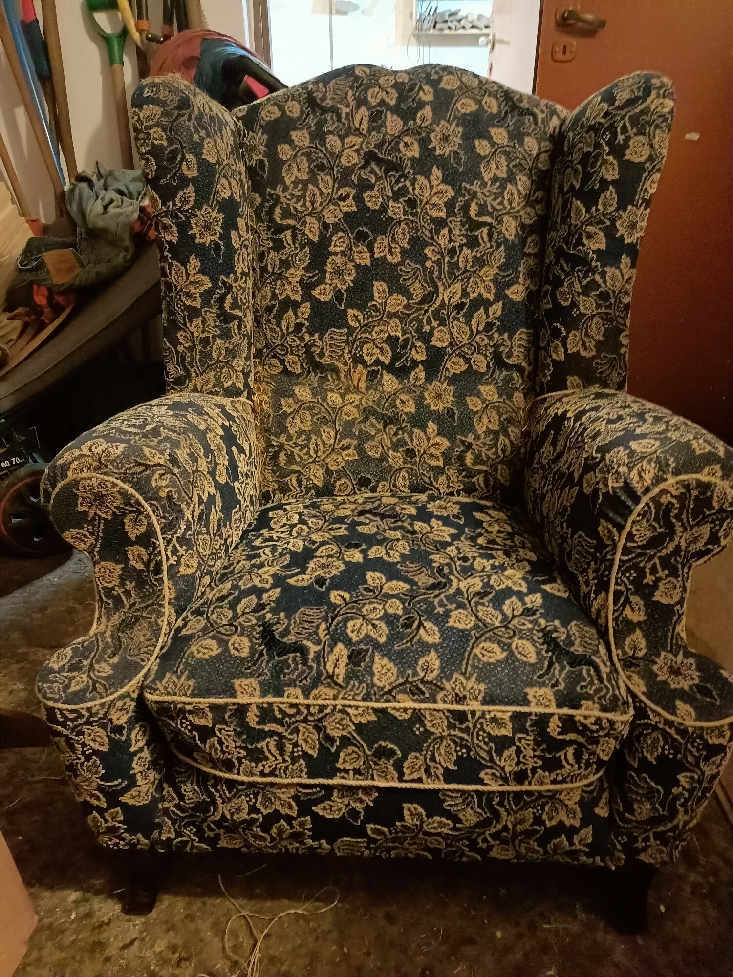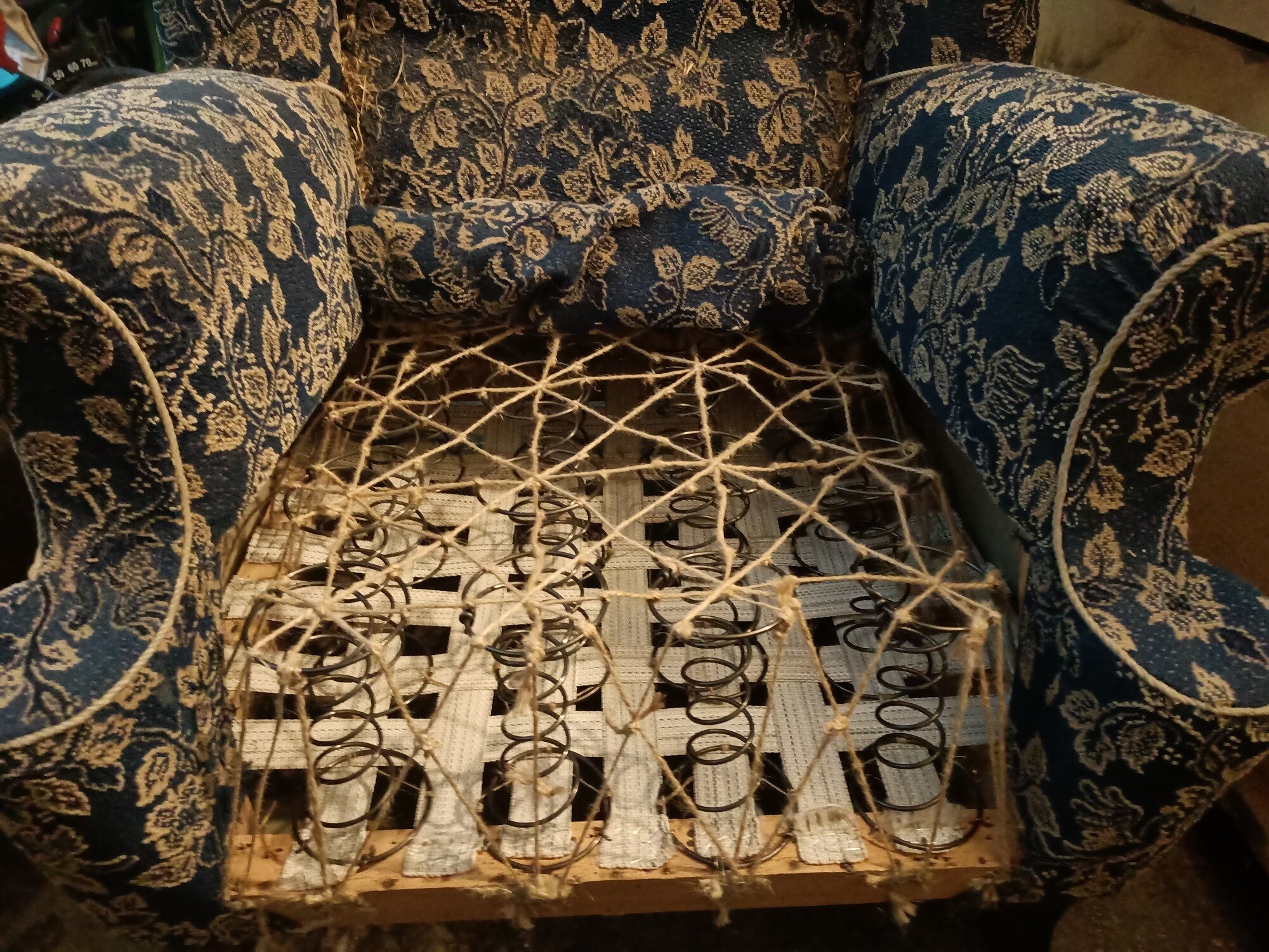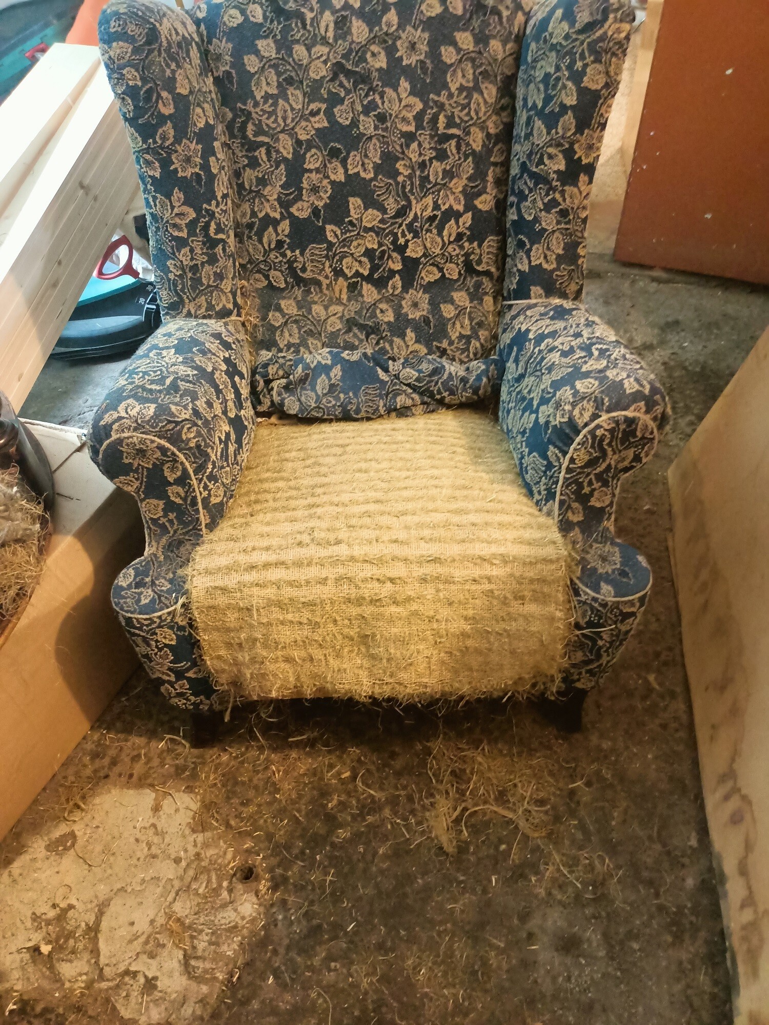 Ten ponad 100-letni fotel posiada tapicerkę w wyjątkowo dobrym stanie. Klientowi zależało aby zachować oryginalne poszycie natomiast naprawy wymagały sprężyny oraz pasy. Nowe sprężyny zostały tradycyjnie związane a na nie położona nowa warstwa trawy morskiej.