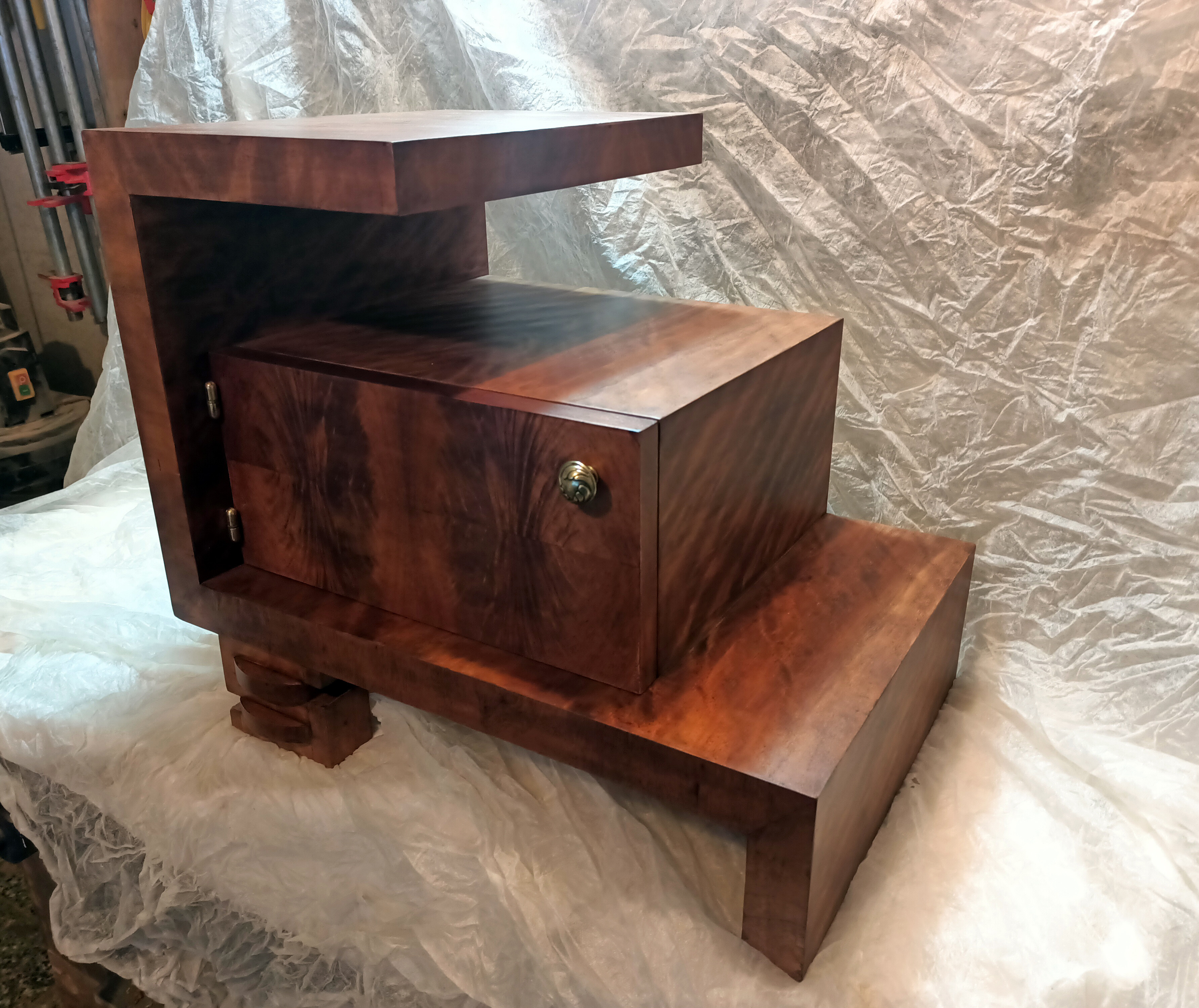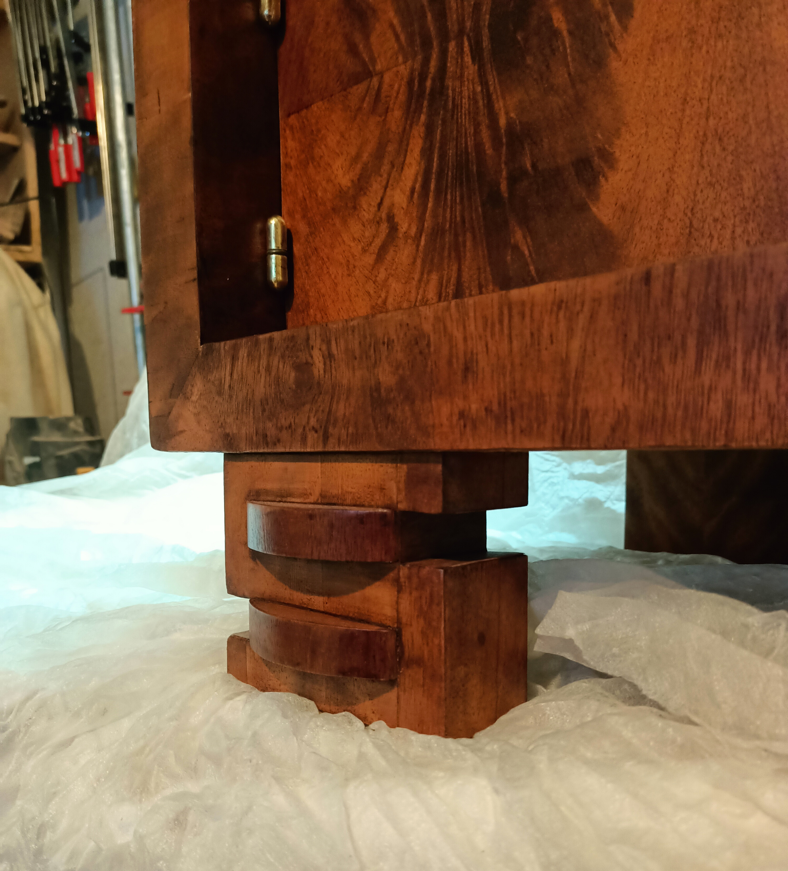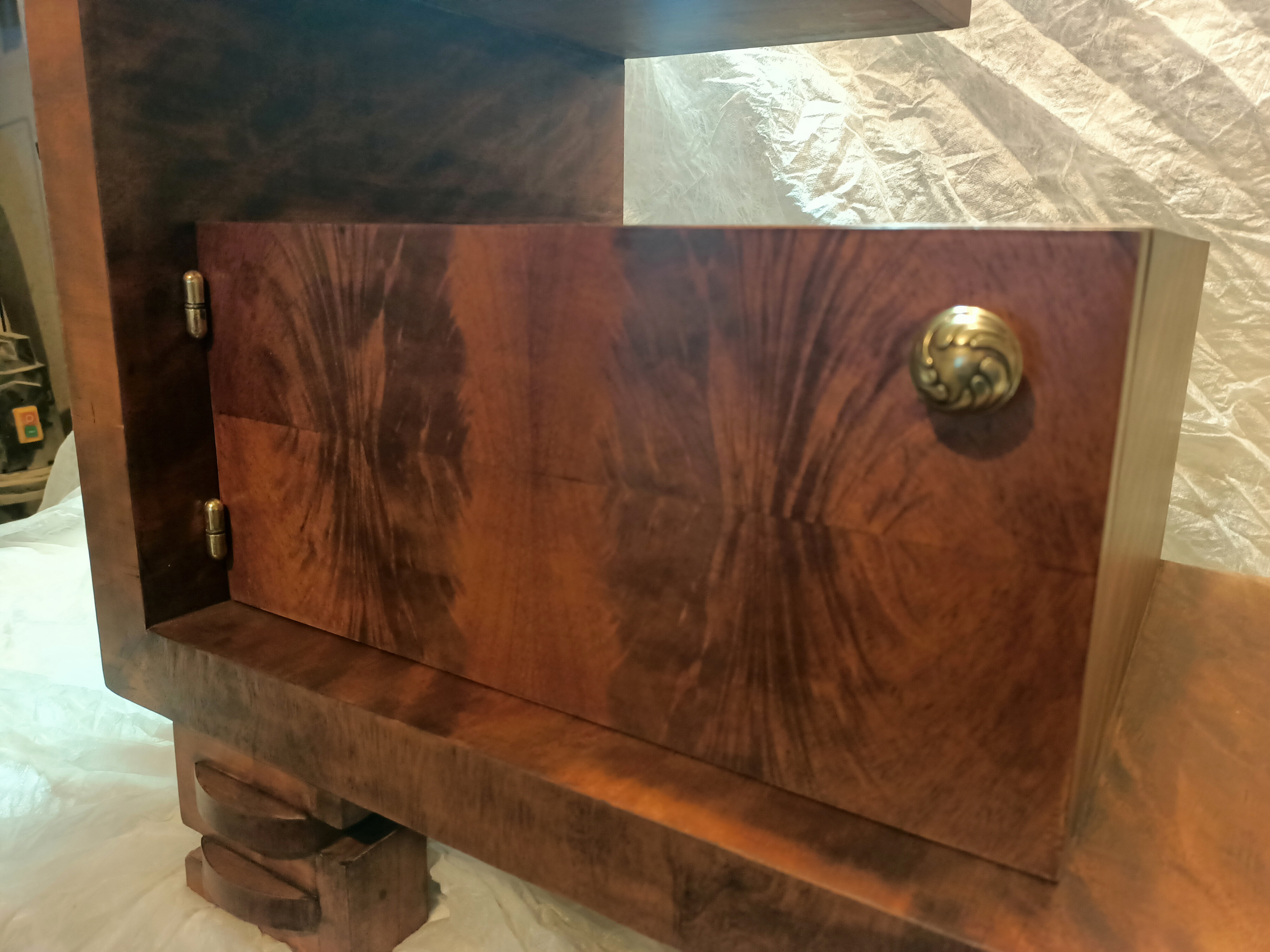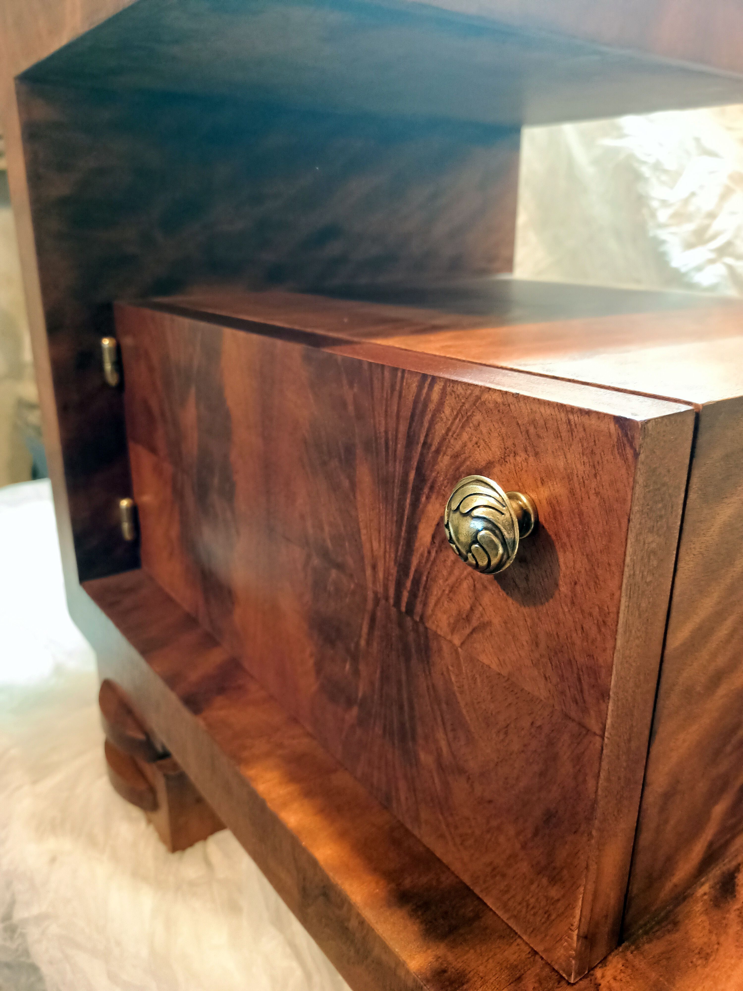 Ta wyjątkowa szafka stanowi jeden z elementów historii jakie pozostawiła po sobie bliska osoba właściciela mebla. Szafka Art Deco wymagała podklejenia forniru w wielu miejscach oraz uzupełnienia licznych ubytków. Przywrócony został kolor, a elementy mosiężne został wypolerowane. Uzupełniono również brakującą gałkę. Zgodnie z życzeniem klienta całość została pokryta lakierem.