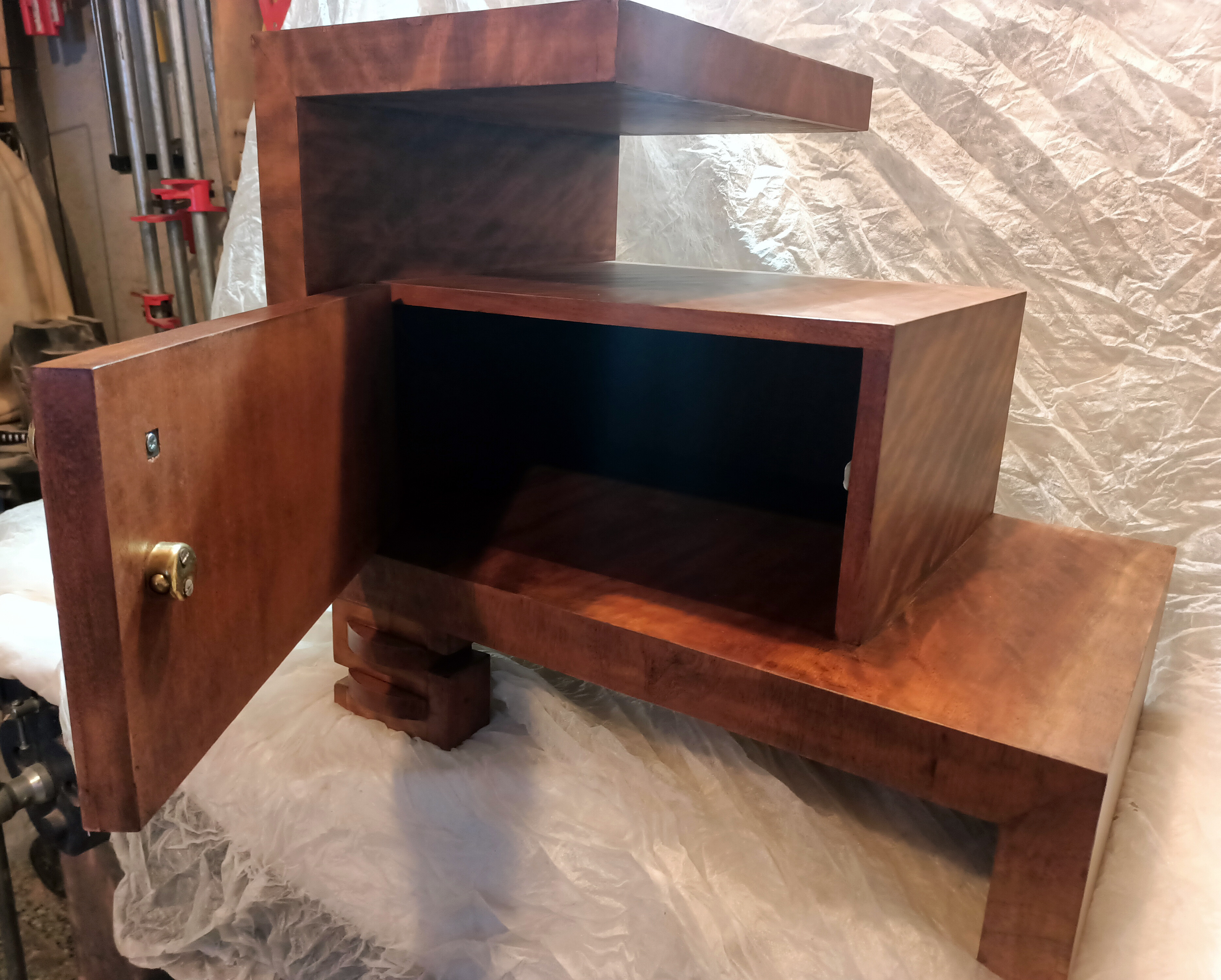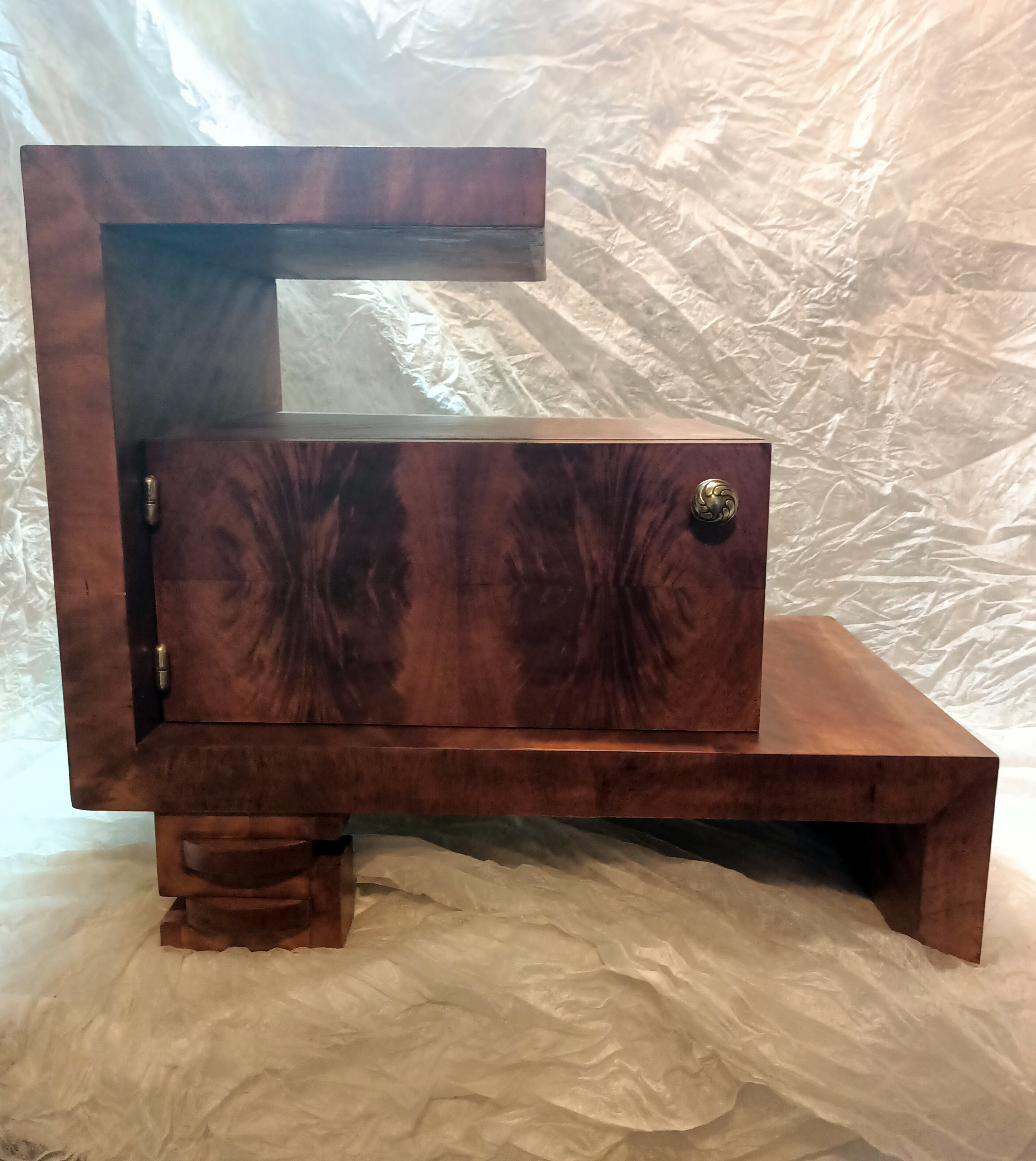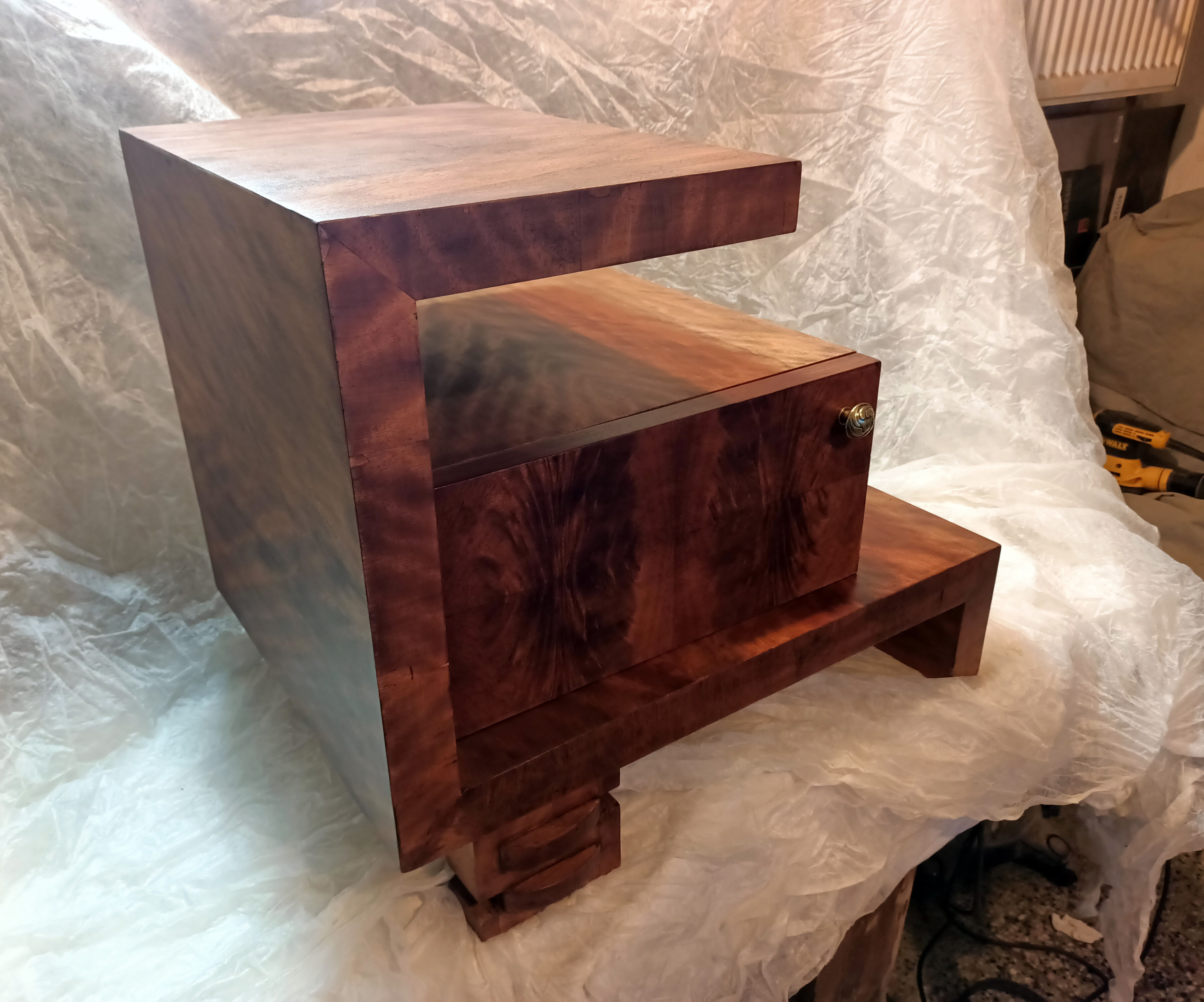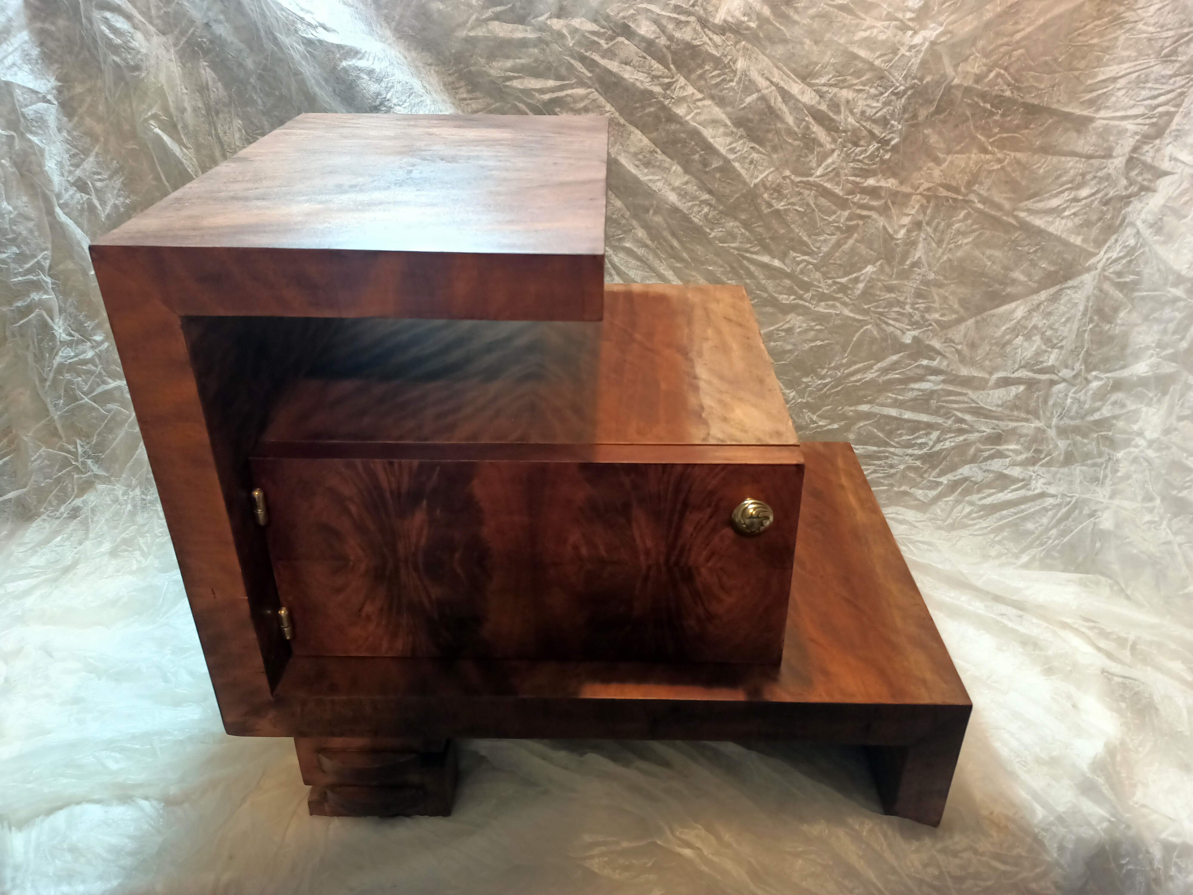 Ta wyjątkowa szafka stanowi jeden z elementów historii jakie pozostawiła po sobie bliska osoba właściciela mebla. Szafka Art Deco wymagała podklejenia forniru w wielu miejscach oraz uzupełnienia licznych ubytków. Przywrócony został kolor, a elementy mosiężne został wypolerowane. Uzupełniono również brakującą gałkę. Zgodnie z życzeniem klienta całość została pokryta lakierem.